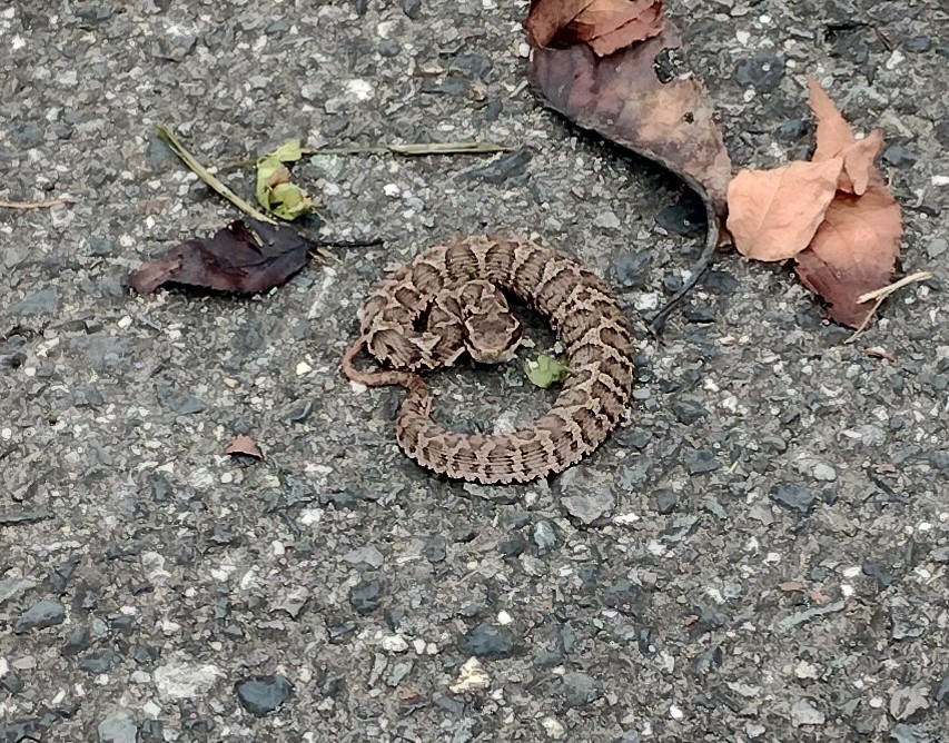 写真は法面上から道路上に移した後撮影したものですが、最初熊手で引っかけてひっくり返したらしく下腹側が上になり緑白色の腹が見えた状態で違和感に気づき「あっ本当に出た」と思って瞬間ですがびっくりしました。